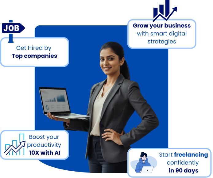 You’ll master 40+ industry tools, 20+ AI Tools including Google Ads, Meta Ads Manager, WordPress, Canva Pro, SEMrush, Ahrefs, HubSpot, GA4, and Shopify/Dukaan for E-commerce.